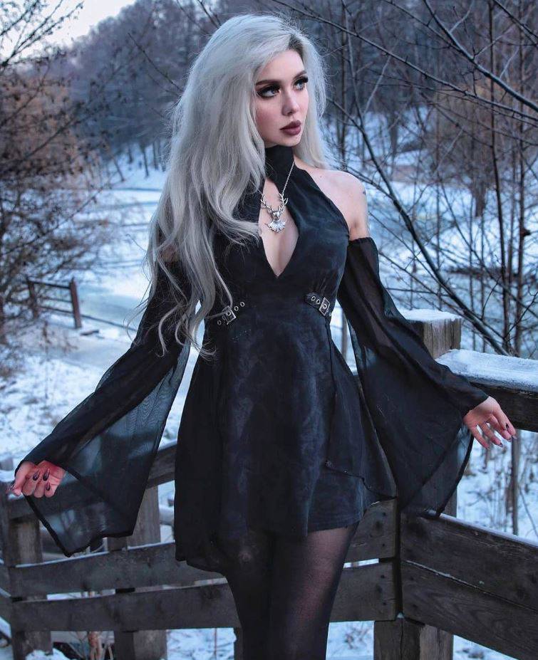 Jurk vastgemaakt rond de nek. De kraag kan worden aangepast. De snit is getailleerd, licht uitlopend. Decoratieve, verstelbare gespen. Lange, wijd uitlopende mouwen van chiffon. Ze hebben een elastische band zodat ze perfect op je schouders blijven zitten. De jurk wordt aan de achterkant vastgemaakt met een onzichtbare ritssluiting. Gemaakt van katoen met een beetje verwassen effect. 95% katoen, 5% spandex.
