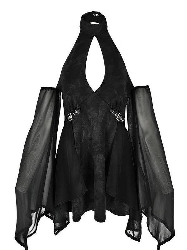 Elegant Floaty Fairy Dress With Adjustable Collar And Chiffon Sleeves - Cotton & Spandex Blend