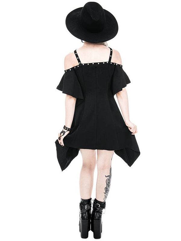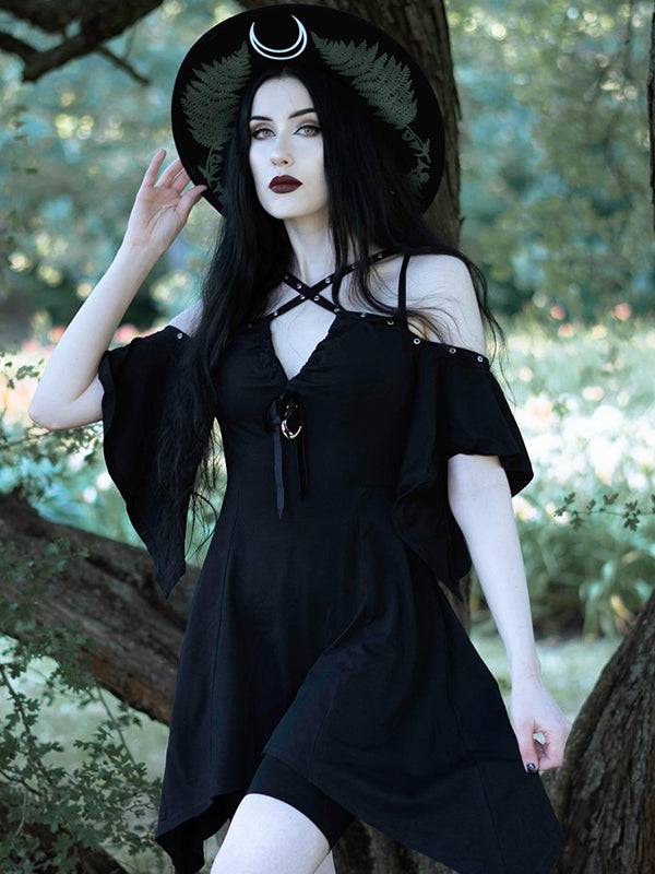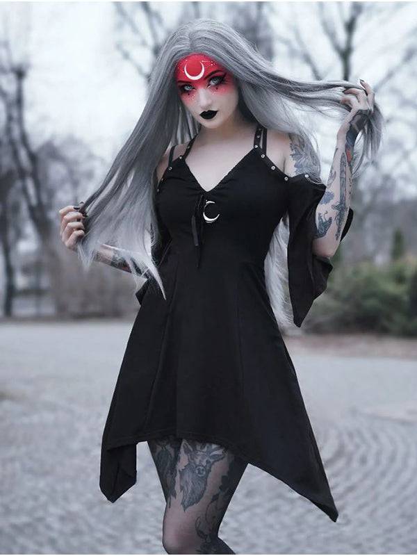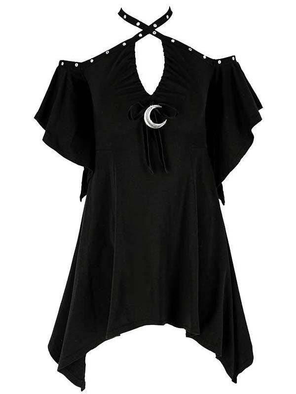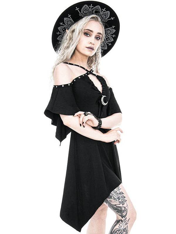 Restyle Calista Asymmetrical Dress with V-Neck, Ruffles, and Decorative Moon Crescent - 100% Cotton