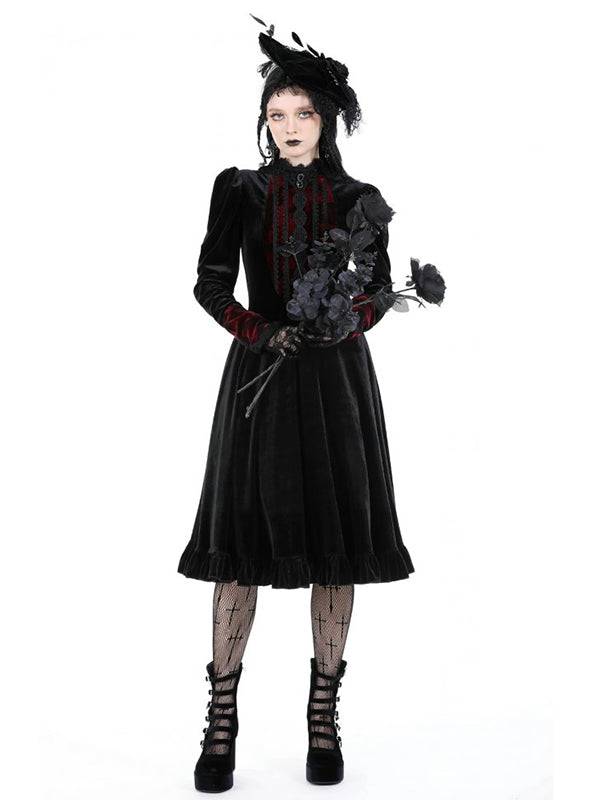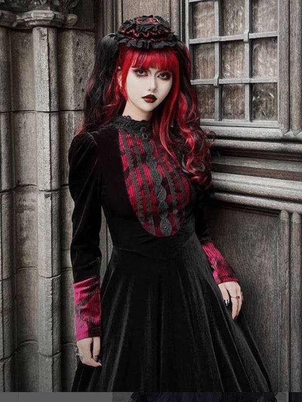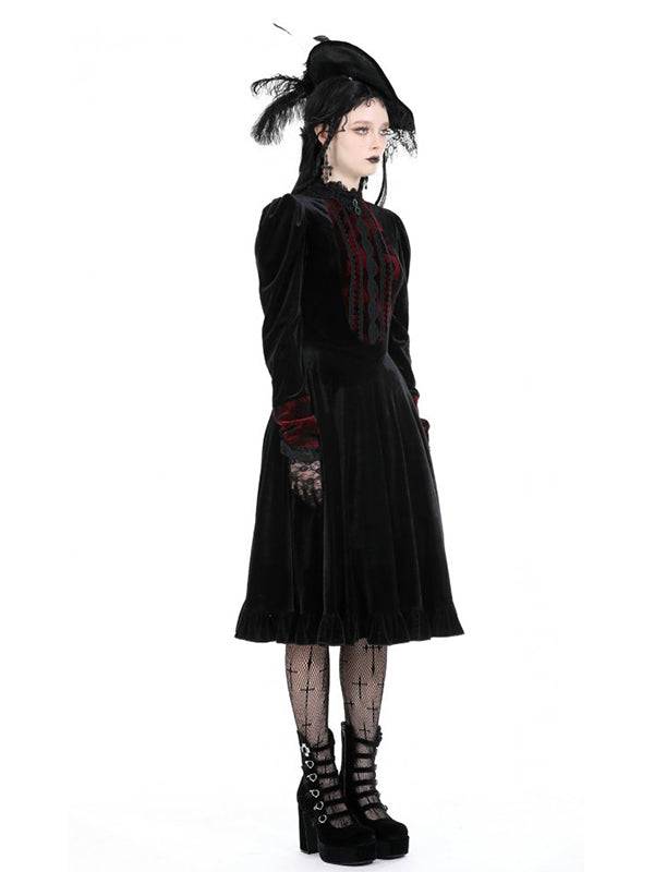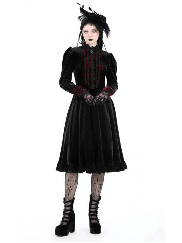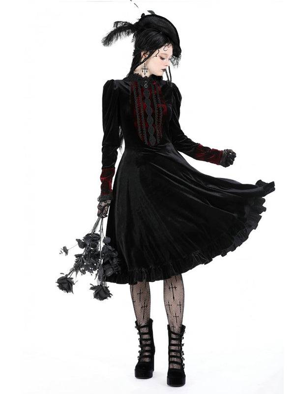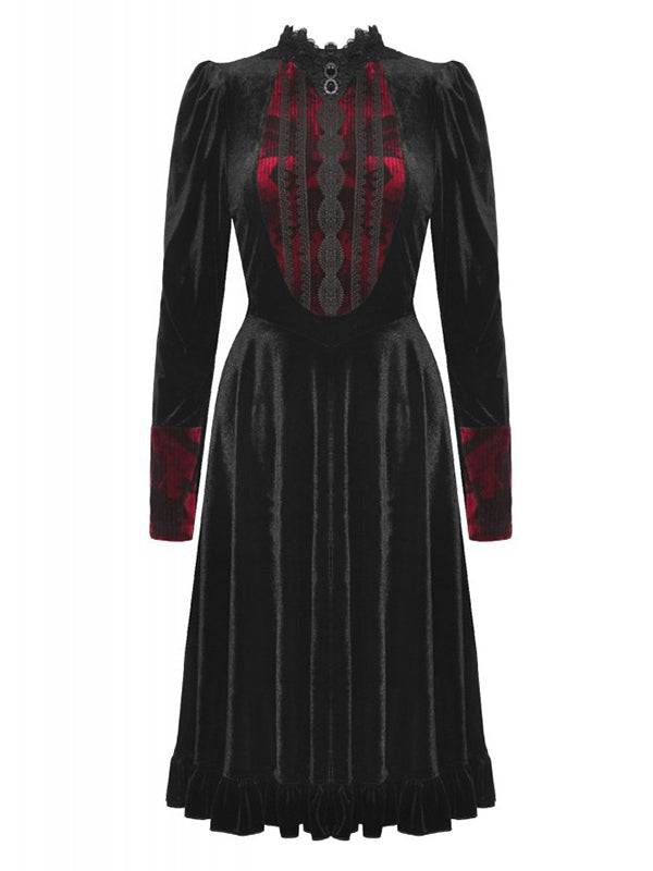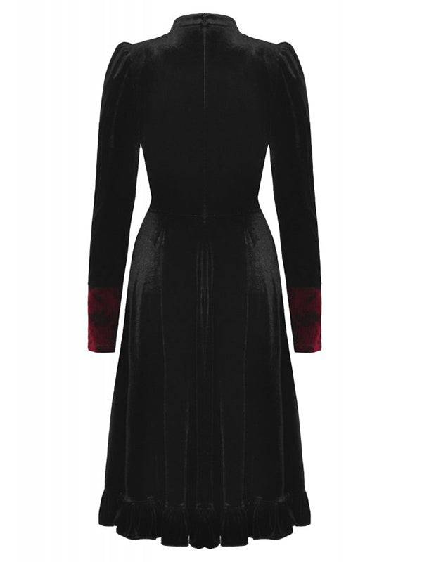 Zwart en Scarlet Rood Vintage fluwelen middellange jurk. De stof is 100% polyester. Lange pofmouwen. Kanten appliqué-accenten op de kraag en borst. Rits aan de achterkant.