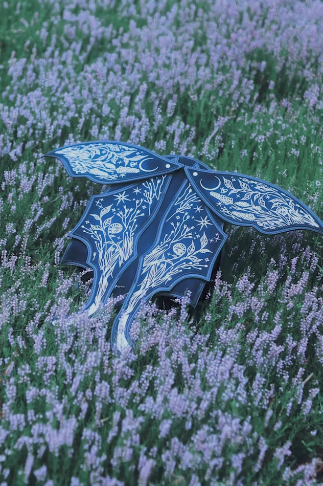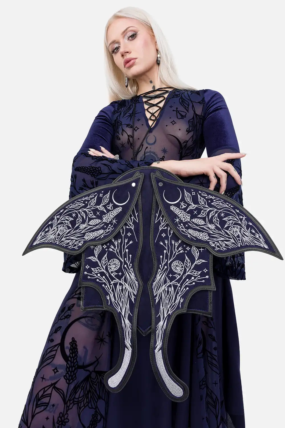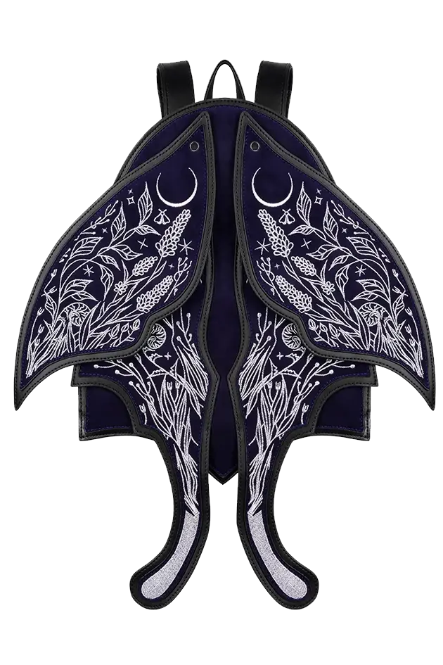 A realistic winged moth backpack that doesn’t just hold your belongings - it carries the night sky with you. Fully embroidered 3D wings shimmer with silver threads depicting night-blooming flora, crescent moons, and stars. The wings are movable, letting you transform your look in a heartbeat.
