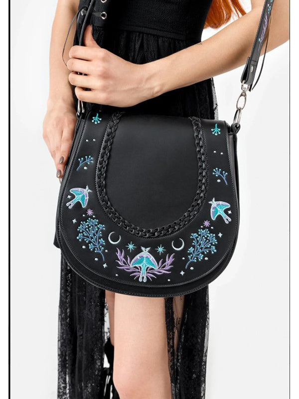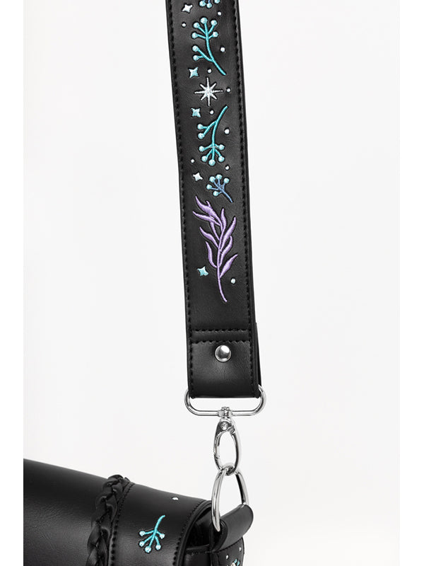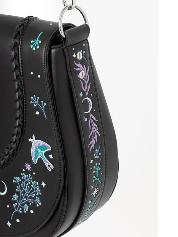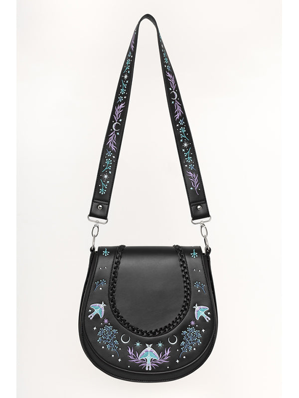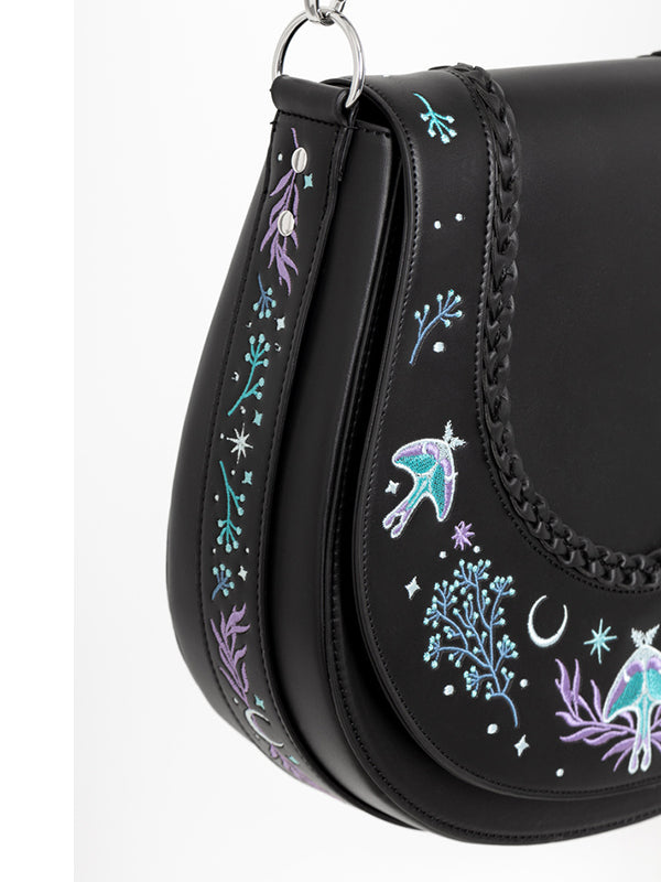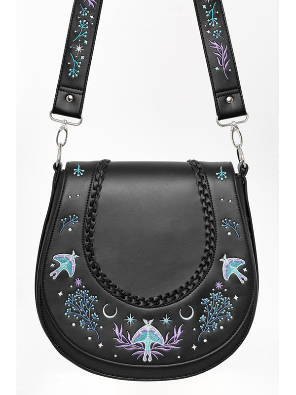 De geborduurde Moonglow-tas is geïnspireerd op betoverde bossen en sprookjesachtige rijken. Ingewikkeld Moonglow-borduurwerk voor een mystieke esthetiek. Gevlochten details op de voorflap voor extra textuur. Veilige ritssluiting met maanvormige trekkers. Binnenzak met ritssluiting en opgestikte zakken voor eenvoudige organisatie Polyester voering voor duurzaamheid.