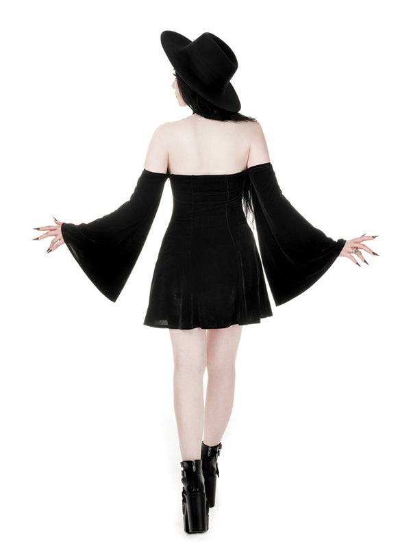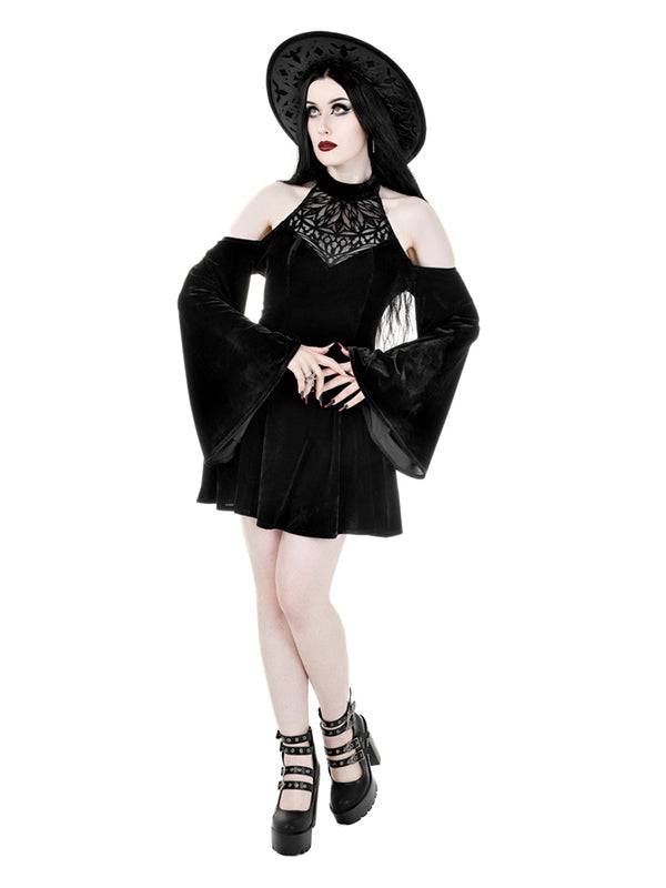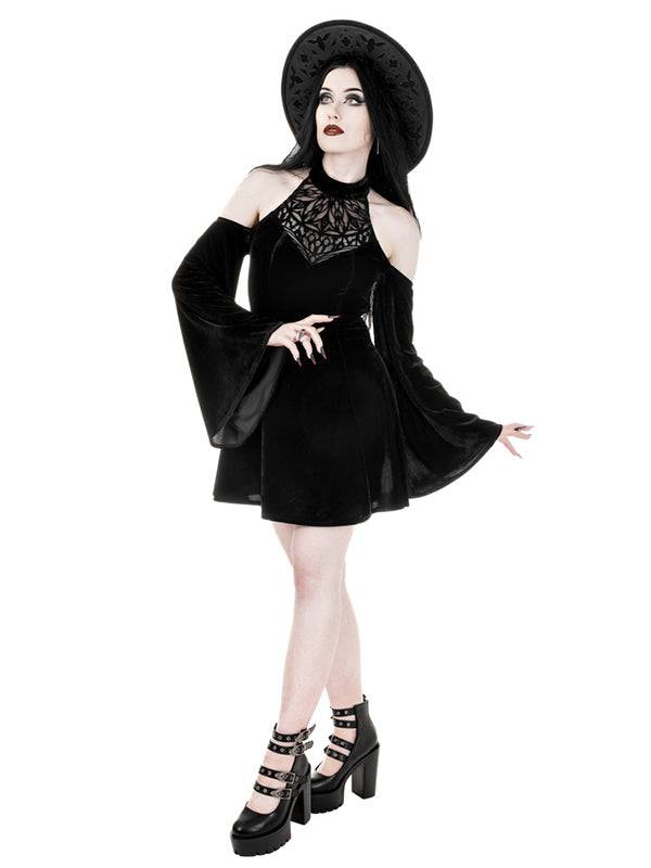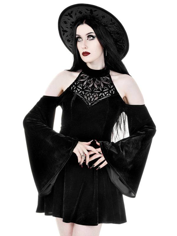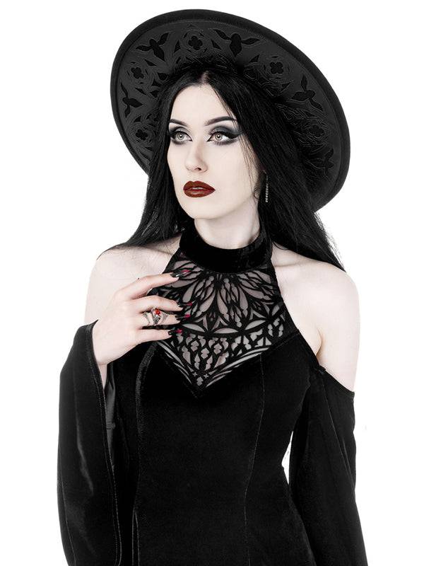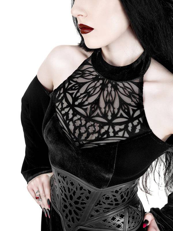 Rosarium Gothic Dress - Luxe Black Stretch Velvet with Cathedral Flock Print & Halter Neck