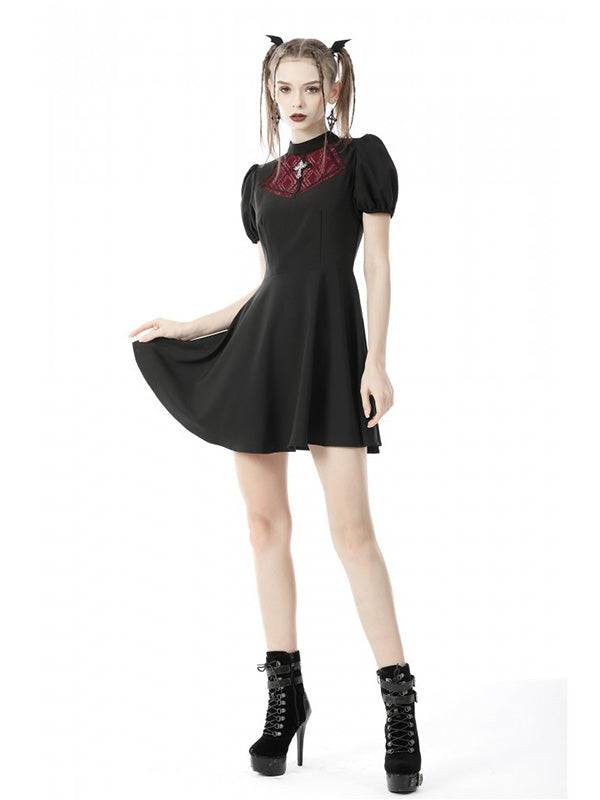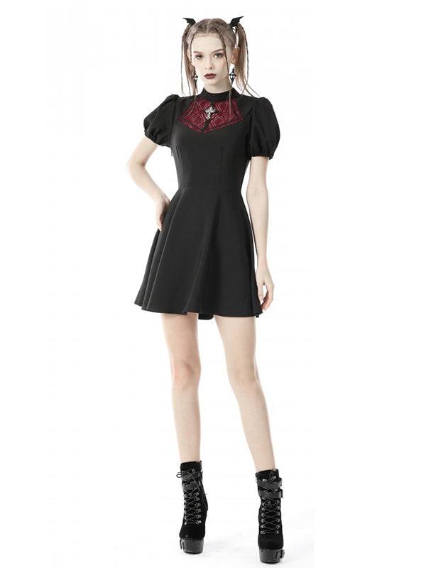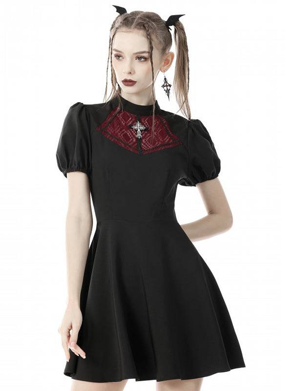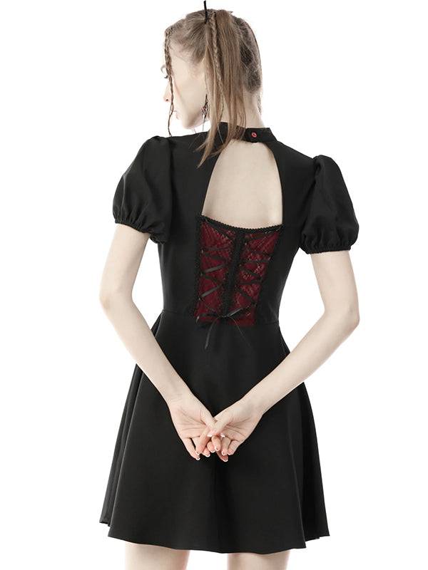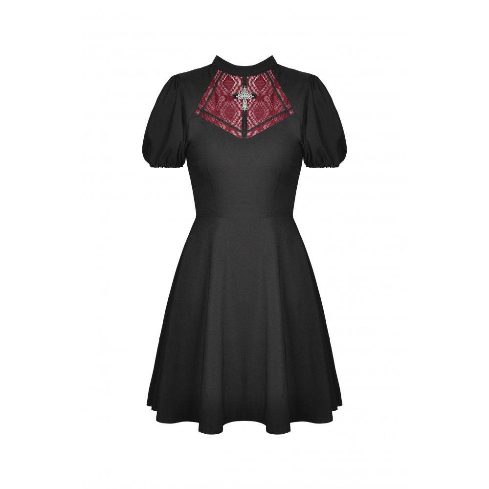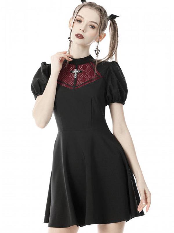 Chic Black Dress With High Collar, Puff Sleeves And Crimson Lace Contrast - S - Op voorraad is in bestelling en wordt verzonden zodra het weer op voorraad is