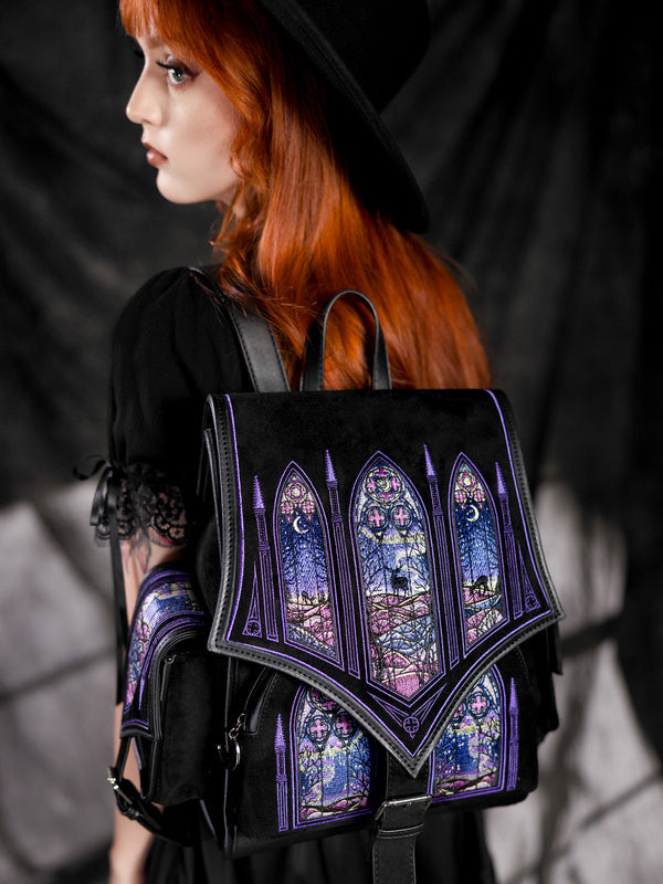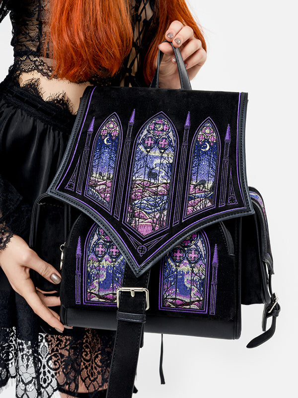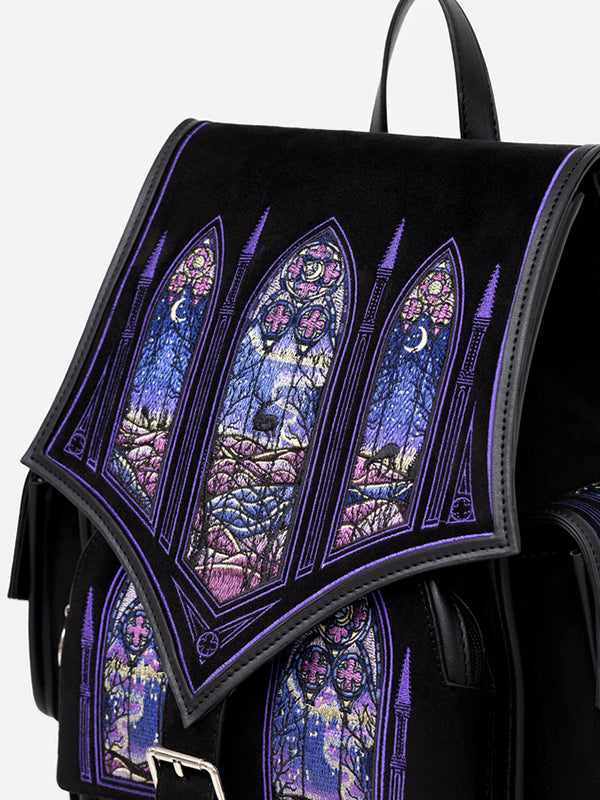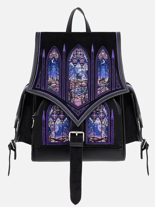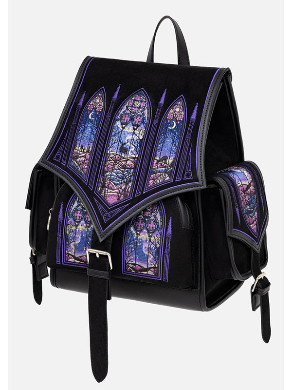 Rugzak met ingewikkeld borduurwerk van noorderlicht, gothic boogramen en torenspitsen op de klep, zijzakken en voorzak. Gemaakt van diepzwart 'faux' suède en contrasterende PU lederen bekleding. Magnetische sluiting op het hoofdvak en de zijvakken. Ruim hoofdcompartiment met twee functionele zijvakken. Georganiseerd interieur met een ritsvak en opgestikte zakken. Verstelbare schouderbanden voor een perfecte pasvorm.  Beschermende metalen voetjes aan de basis. Unieke maanvormige ritstrekkers. 100% polyester voering voor extra duurzaamheid.
