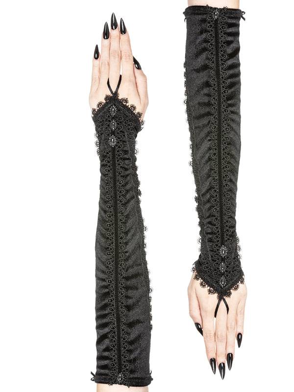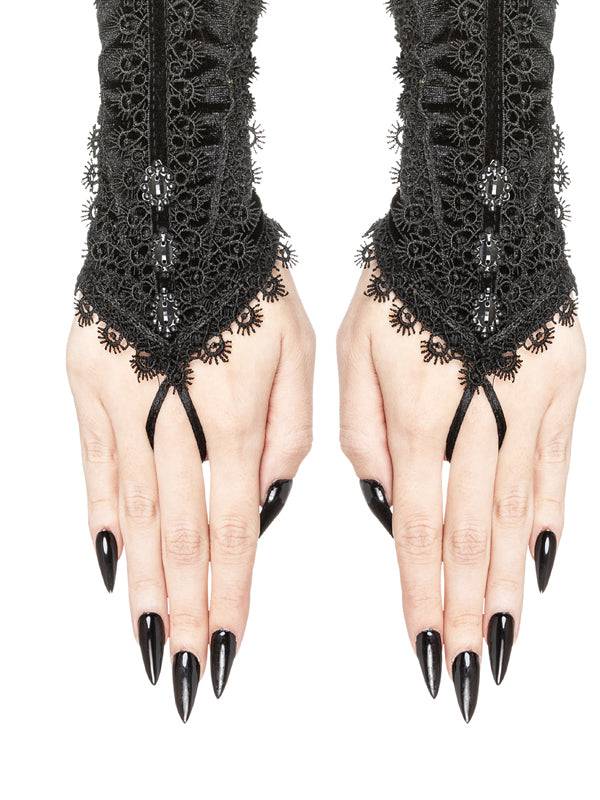 Zwarte lange fluwelen handschoenen gedetailleerd met delicaat brokaatkant gecombineerd met fluwelen lintafwerking en glanzende traanvormige applicatie. Deze handschoenen hebben een vingerlus van satijnen lint. Licht elastisch voor een perfecte aansluitende pasvorm.