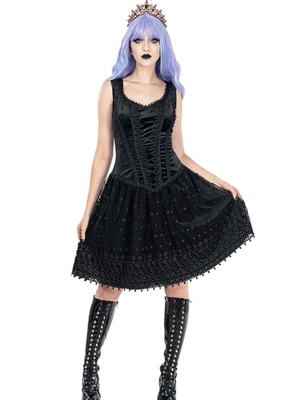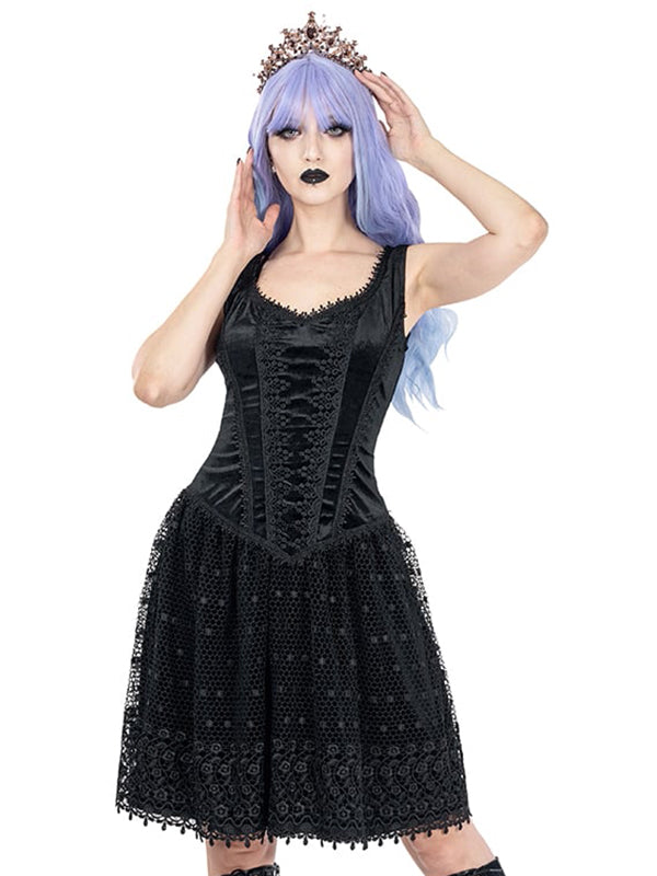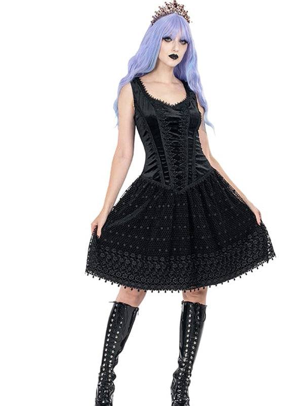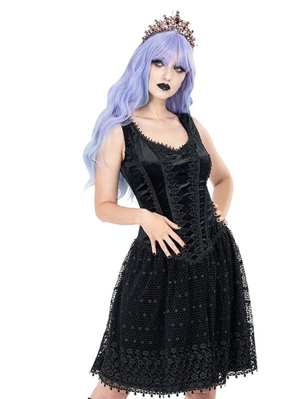 Zwart fluwelen Gothic Lolita jurk met een sweetheart halslijn. Het fluwelen topje is versierd met verschillende soorten brokaatkant. De bovenste laag van de fluwelen rok is gemaakt van zwaar brokaatkant met een patroon. Verborgen ritssluiting middenachter.