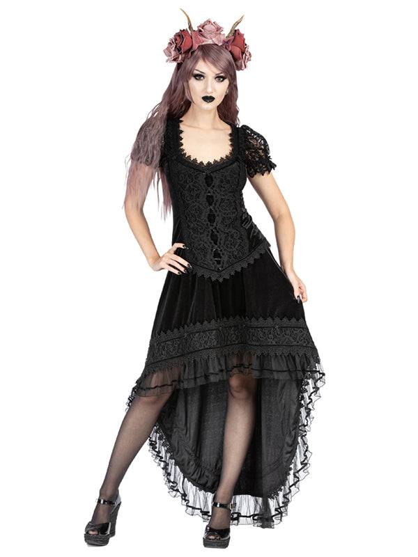 Zwart fluwelen hoog-laag rok met Venetiaans kant versierd met brokaatkant en klein fluwelen lint langs de zoom. Aan de zoom van de rok zit een laag zachte mesh-ruches. De rok is versierd met kleine strikjes van satijnen lint en bloemen. Elastische tailleband met onzichtbare ritssluiting aan de zijkant.
