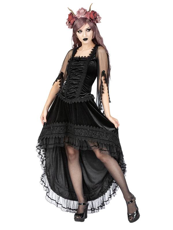 Black Velvet High-Low Skirt With Venetian Lace, Mesh Ruffles & Elastic Waistband